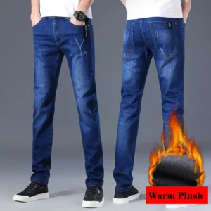 Men Winter Thermal Jeans Snow Warm Stretch Straight Jeans Man Fleece Denim Long Pants Cool Narrow Leg Slim Fit Blue Trousers